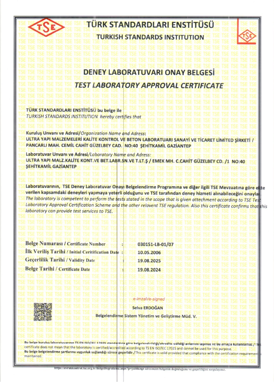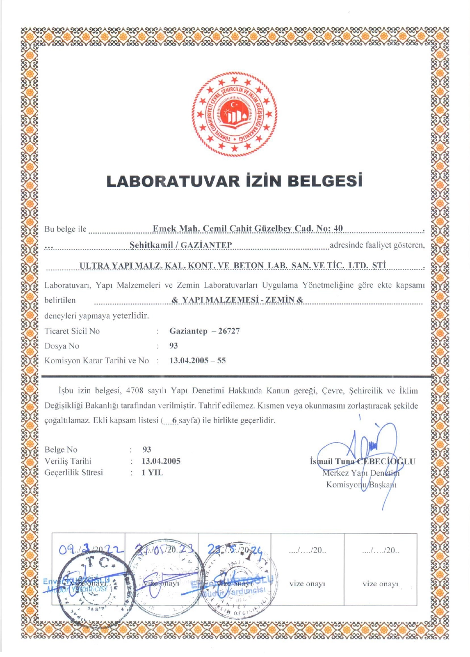 Ultra Yapı Malzemeleri Kalite Kontrol ve Beton Laboratuarı faaliyetlerine; T.C. Çevre, şehircilik ve iklim değişikliği bakanlığı yetkili laboratuarı olarak ve aynı zamanda Türk Standardları Enstitüsünün (TSE) anlaşmalı inşaat laboratuarı olarak devam etmektedir. Bu anlamda hem T.C. Çevre, şehircilik ve iklim değişikliği bakanlığı’ndan hem de Türk Standartları Enstitüsünden yetkili olan bölgemizin İLK YAPI MALZEMELERİ KALİTE KONTROL VE BETON laboratuvarıdır.